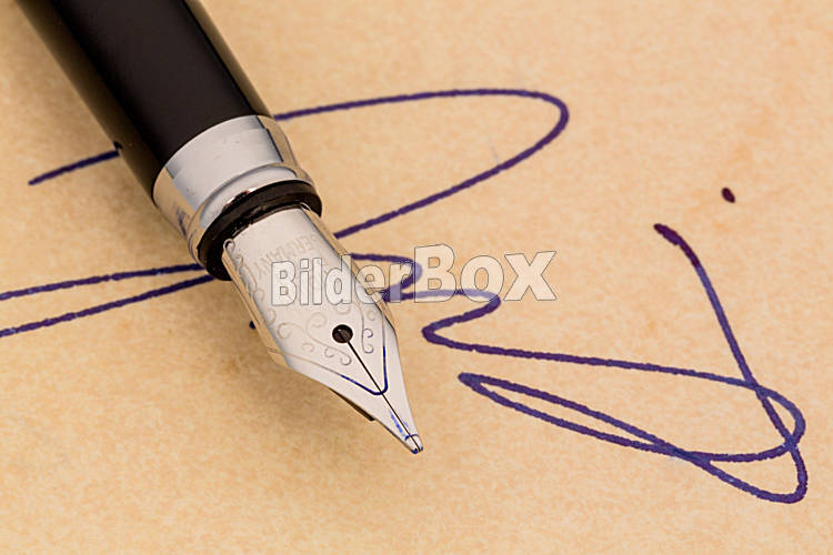 Beschreibung Eine Unterschrift und ein Füllhalter auf gelben Papier. Symbolfoto für Vertrag, Testament und Grafologie