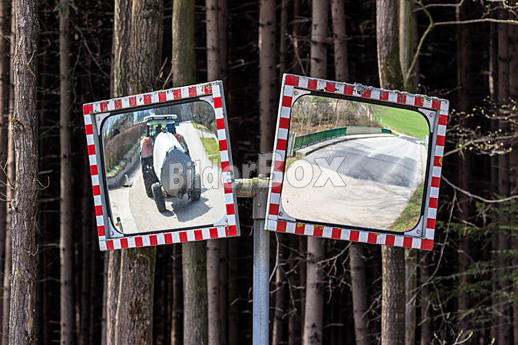 Beschreibung Zwei verkehrsspiegel stehen an der Kreuzung einer Straße