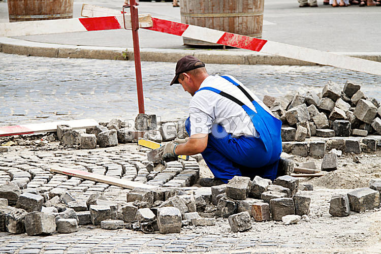 Beschreibung Ein Mann verlegt Pflastersteine auf einem Platz