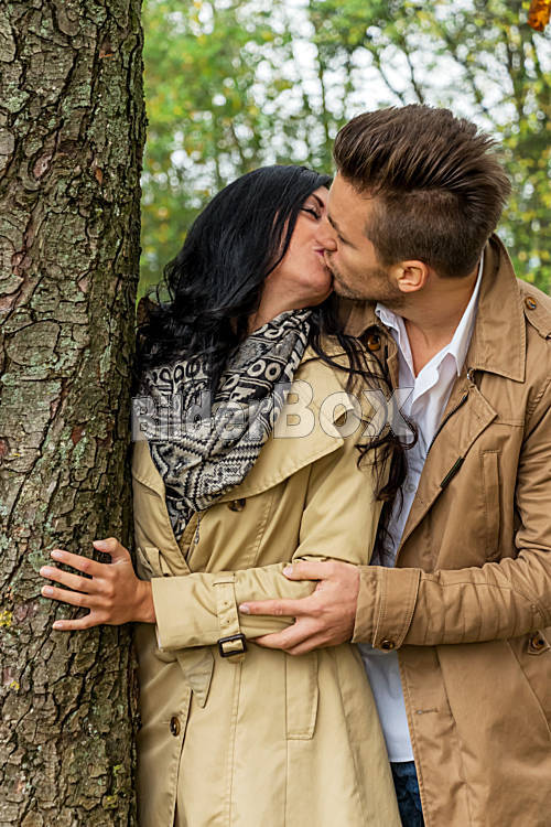 Beschreibung Ein junges, verlliebtes Paar schaut hinter einem Baum hervor