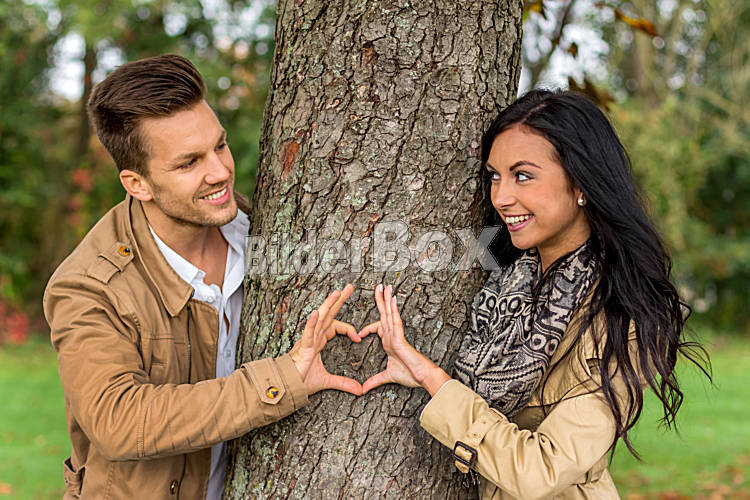 Beschreibung Ein junges, verlliebtes Paar schaut hinter einem Baum hervor