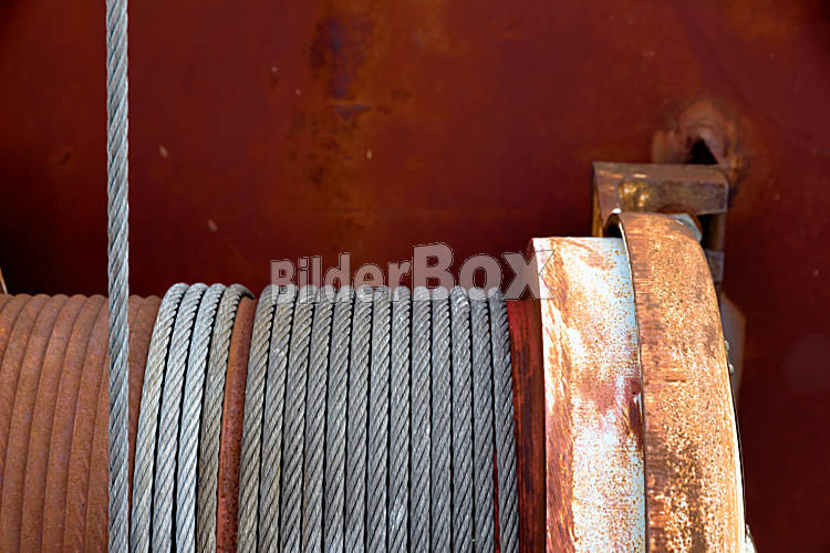 Beschreibung Verrostete Seilwinde, Symbol für Kraft, Zuverlässigkeit, Hilfe