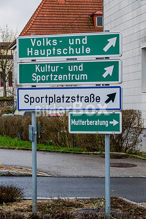 Beschreibung Verschiedene Schilder in einer Kommune, Symbol für kommunale Leistungen