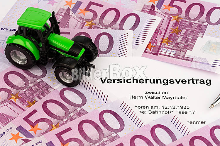 Beschreibung Der Vertrag einer Versicherung für einen neuen Traktor. Mit Eurogeld und Kugelschreiber. Versicherungen für die Landwirtschaft für Gefahren und Hagel