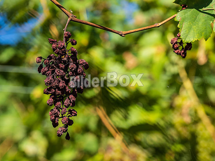 Beschreibung Auf Reben in einem Weingarten hängen verdörrte vertrocknete Weontrauben
