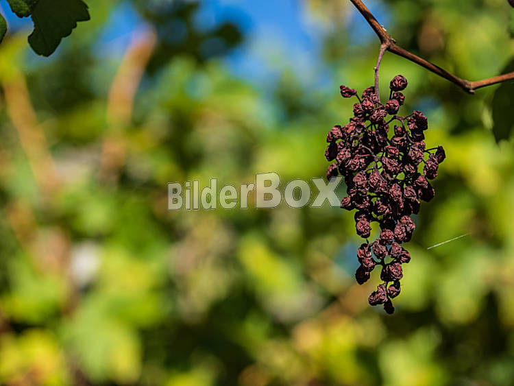 Beschreibung Auf Reben in einem Weingarten hängen verdörrte vertrocknete Weontrauben