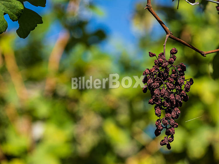 Beschreibung Auf Reben in einem Weingarten hängen verdörrte vertrocknete Weontrauben