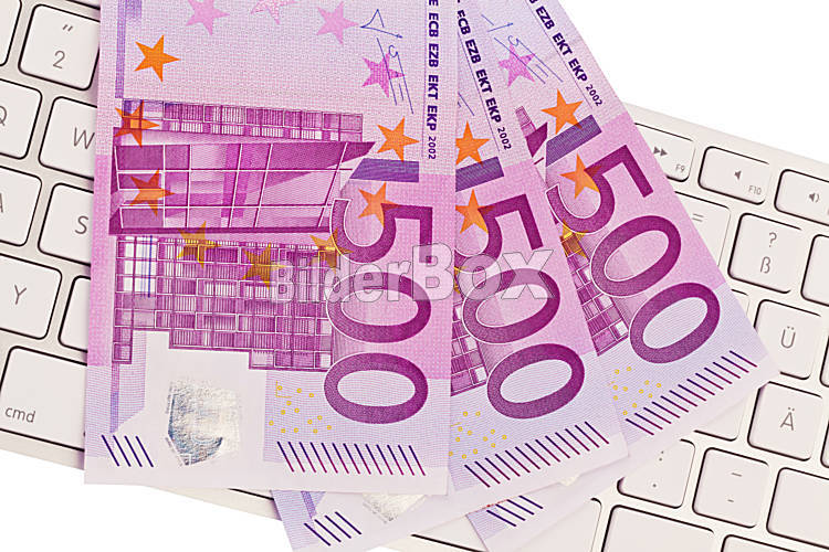 Beschreibung Viele 500 Eurogeld Banknoten liegen auf einem Stapel. Auf einer Computer Tastatur