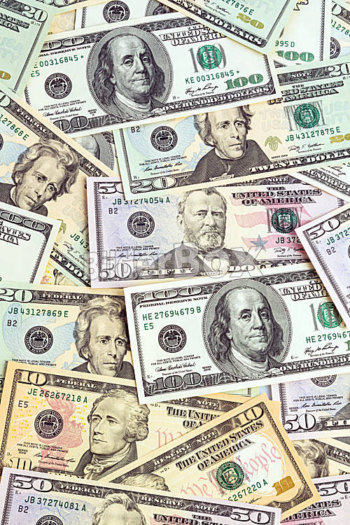 Beschreibung Viele amerikanische Dollar Geldscheine. Symbolfoto für Schulden und Reichtum