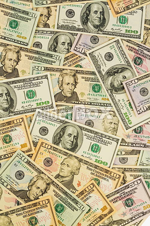 Beschreibung Viele amerikanische Dollar Geldscheine. Symbolfoto für Schulden und Reichtum