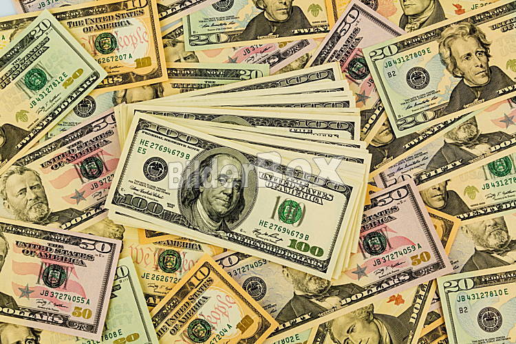 Beschreibung Viele amerikanische Dollar Geldscheine. Symbolfoto für Schulden und Reichtum