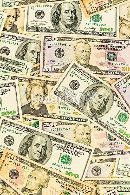 Beschreibung Viele amerikanische Dollar Geldscheine. Symbolfoto für Schulden und Reichtum