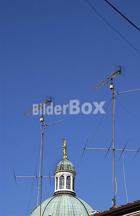 Beschreibung Fernsehantennen auf einem Hausdach in Italien mit Kirchturm Copyright (2002) by BilderBox.com; Erwin Wodicka, A-4062 Thening. www.bilderbox.com. + und im als mit beim & and beim als auf...