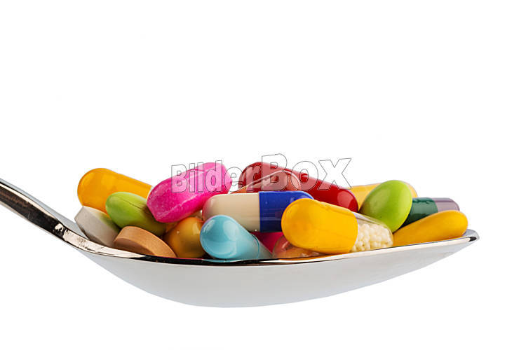 Beschreibung Viele bunte Tabletten auf einem Löffel. Symbolfoto für Tablettensucht und Mißbrauch von Medikamenten.