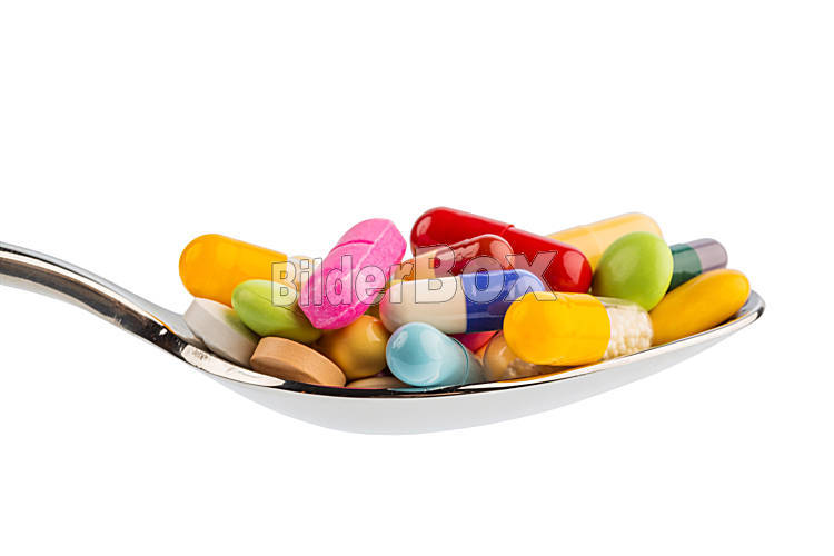 Beschreibung Viele bunte Tabletten auf einem Löffel. Symbolfoto für Tablettensucht und Mißbrauch von Medikamenten.