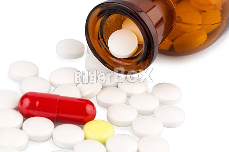 Beschreibung Viele Tabletten mit einem Glasbeghäter. Symbolfoto für Sucht und Kosten in der Medizin und bei Medikamenten.