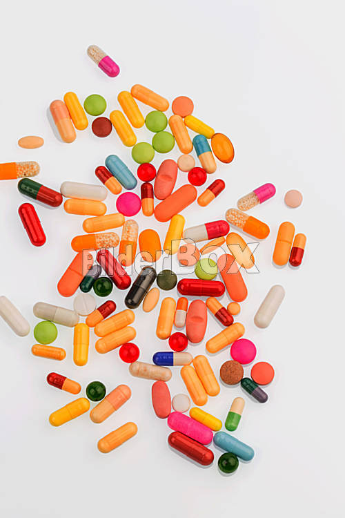 Beschreibung Viele bunte Tabletten auf weißem Hintergrund. Symbolfoto für Medizin und Medikamente