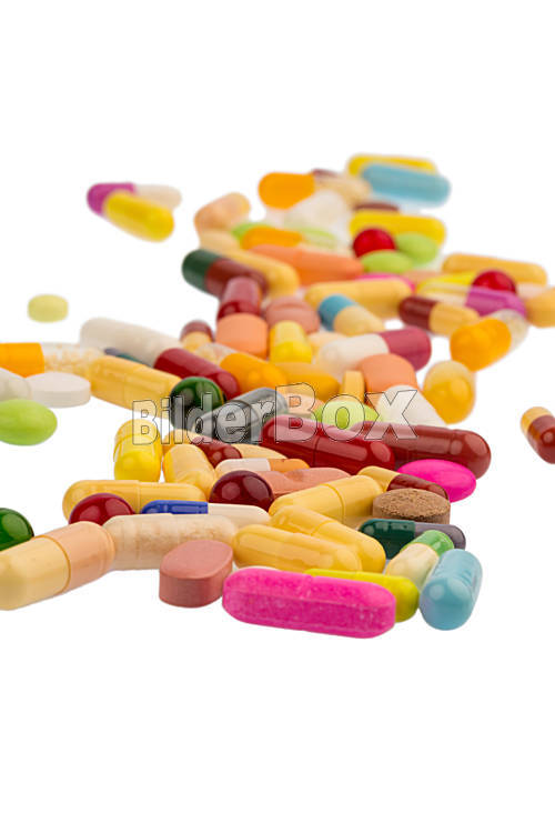 Beschreibung Viele bunte Tabletten auf weißem Hintergrund. Symbolfoto für Medizin und Medikamente