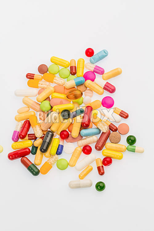 Beschreibung Viele bunte Tabletten auf weißem Hintergrund. Symbolfoto für Medizin und Medikamente