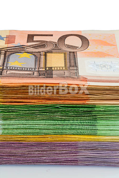 Beschreibung Viele verschiedene Euro Geldscheine. Symbolfoto für Reichtum und Geldanlage