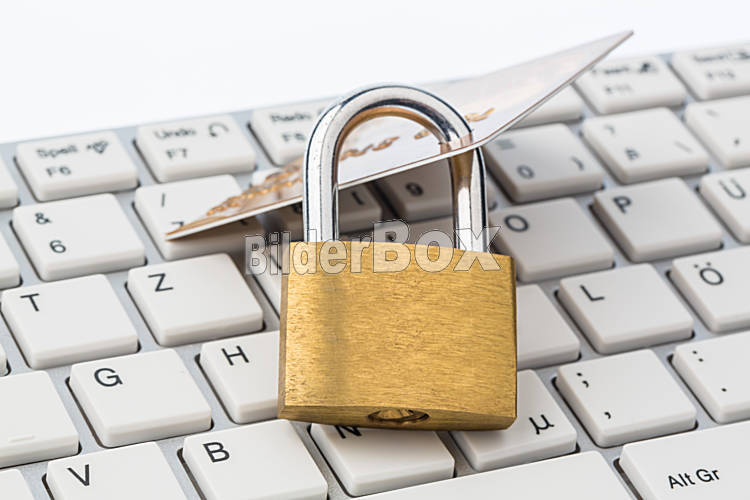 Beschreibung Ein Vorhängeschloss und eine Kreditkarte auf einer Tastatur. Symbol Foto für sicheres bezahlen im Internet, und online Kriminalität