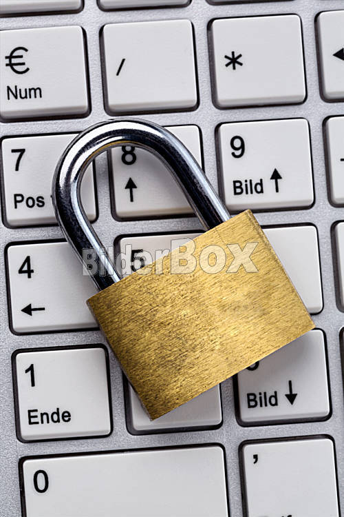 Beschreibung Ein Vorhängeschloss auf einer Computer Tastatur. Symbolfoto für Datensicherheit und Hacking