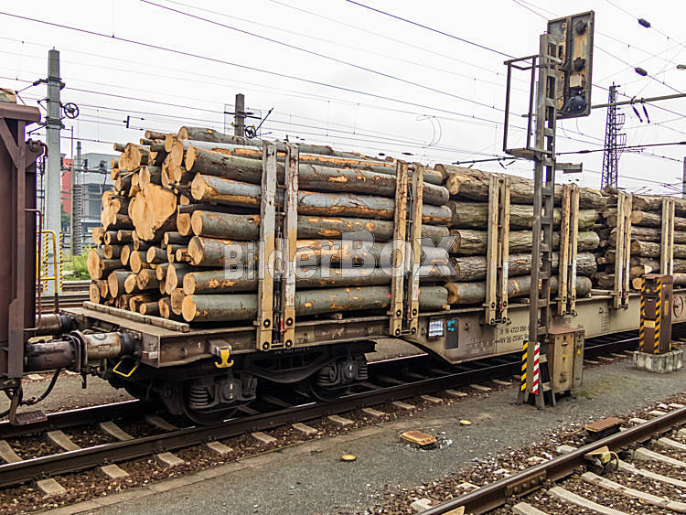 Beschreibung Wagon der Eisenbahn mit Holz beladen. Güterzug. Güterverkehr auf der Schiene