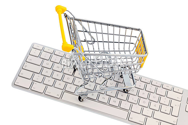 Beschreibung Ein Warenkorb und eine Computer Tastatur. Symbolfoto Online Shopping