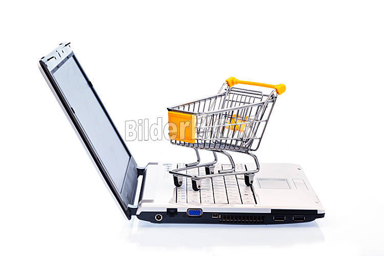 Beschreibung Ein Warenkorb und eine Computer Tastatur. Symbolfoto Online Shopping