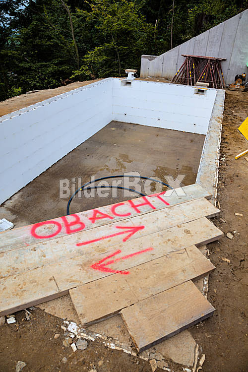 Beschreibung Ein Schwimmbad wird gebaut. Warnung zur Absicherung auf der Baustelle