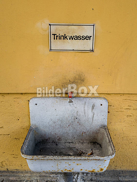 Beschreibung Waschbecken mit Aufschrift Trinkwasser auf einem Bahnhof