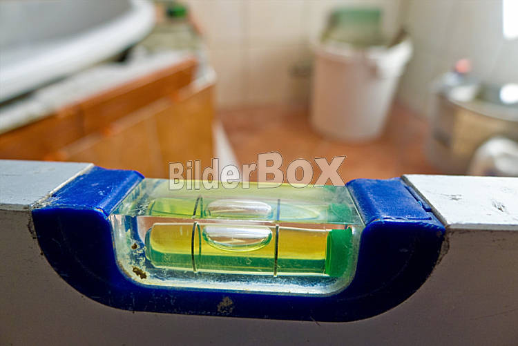 Beschreibung Eine Wasserwaage auf einer Baustelle. Symbolbild für Pfusch am Bau