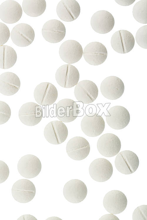 Beschreibung Weiße Tabletten, Symbolfoto für Medizin, Heilmittel und Tablettensucht