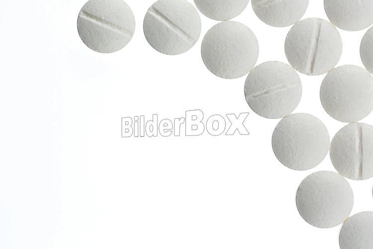 Beschreibung Weiße Tabletten, Symbolfoto für Medizin, Heilmittel und Tablettensucht