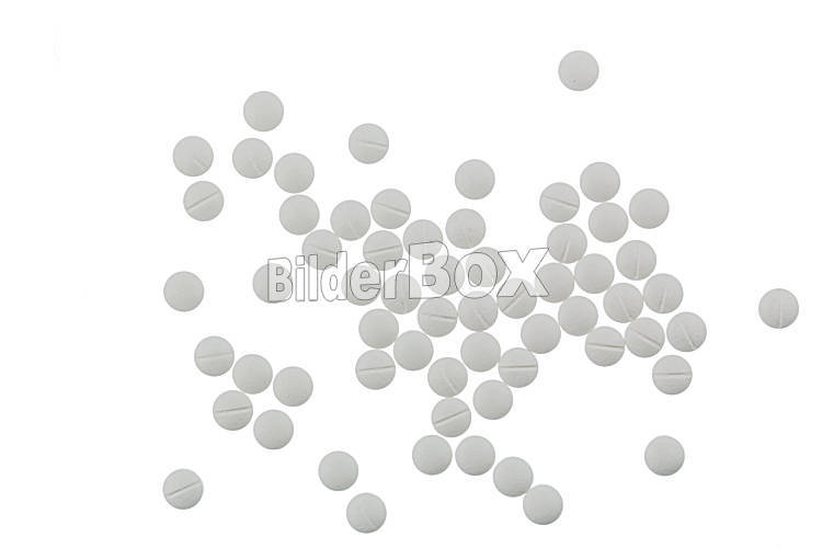 Beschreibung Weiße Tabletten, Symbolfoto für Medizin, Heilmittel und Tablettensucht