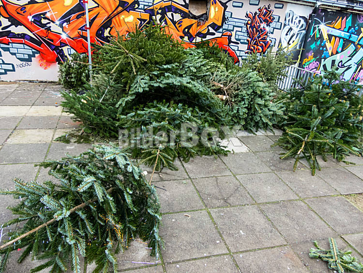 Beschreibung Nach dem Weihnachtsfest werden die Tannenbäume für die Entsorgung gesammelt.