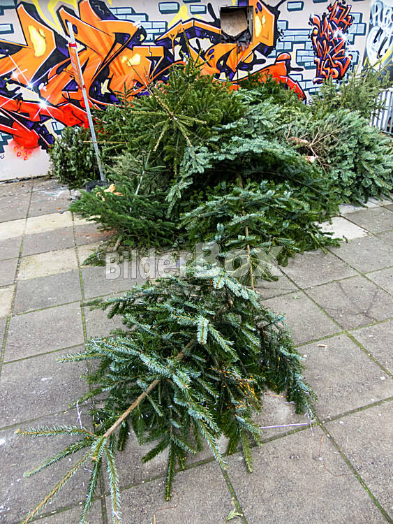 Beschreibung Nach dem Weihnachtsfest werden die Tannenbäume für die Entsorgung gesammelt.