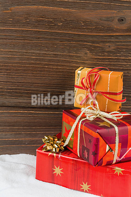 Beschreibung Mehrere Päckchen von Geschenken für Weihnachten liegen aufeinander