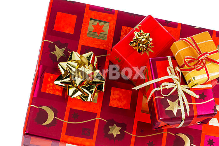Beschreibung Mehrere Päckchen von Geschenken für Weihnachten liegen aufeinander