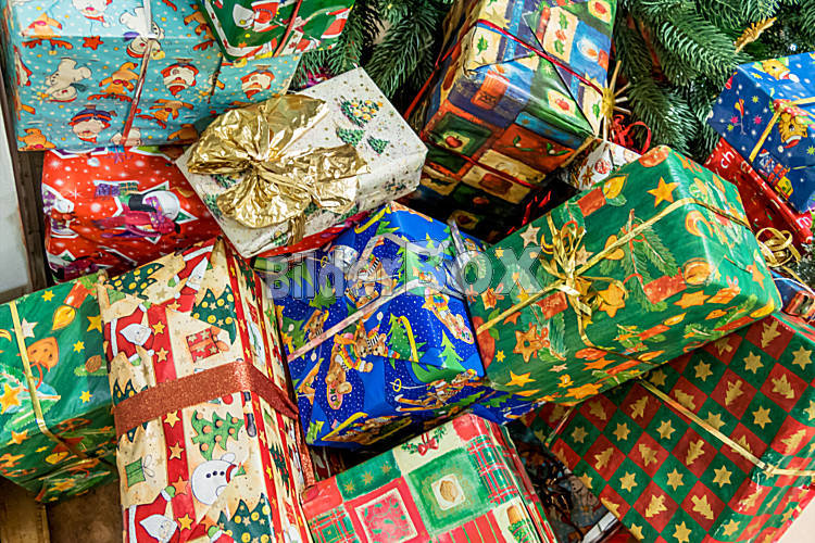 Beschreibung Viele verpackte Weihnachtsgeschenke liegen am heiligen Abend unter dem Christbaum