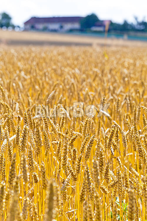Beschreibung Ähren von Weizen auf einem Getreidefeld eines Bauern im Sommer.
