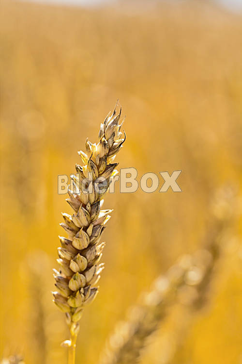Beschreibung Ähren von Weizen auf einem Getreidefeld eines Bauern im Sommer.