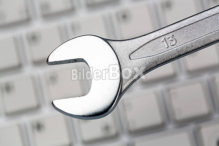 Beschreibung Ein Schraubenschlüssel als Werkzeug auf einer Computer Tastatur. Symbolfoto für Datenschutz, online Kriminalität, und Sicherheit im Internet