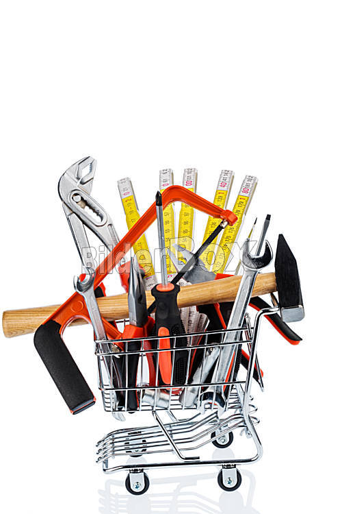 Beschreibung Handwerkzeug in einem Einkaufswagen, Symbolfoto für Handwerk, Werkzeug und Materialbeschaffung