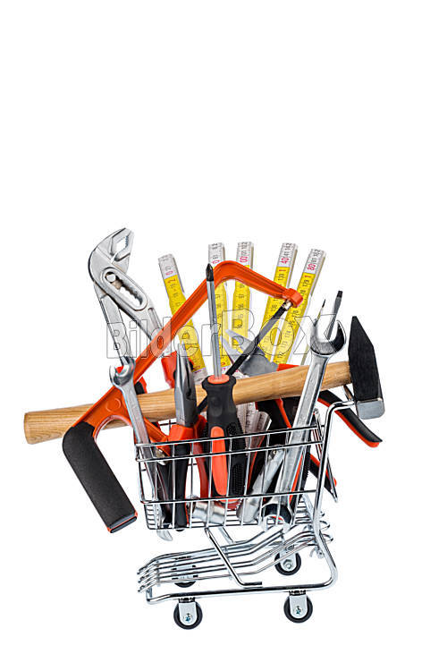 Beschreibung Handwerkzeug in einem Einkaufswagen, Symbolfoto für Handwerk, Werkzeug und Materialbeschaffung