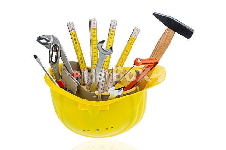 Beschreibung Handwerkzeug in einem Schutzhelm, Symbolfoto für Handwerk, Bauen, Heimwerken