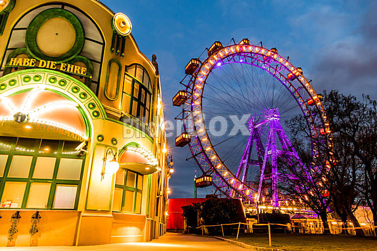 Beschreibung Österreich, Wien. Prater, Riesenrad. Wahrzeichen und bekannt aus dem Film "der dritte Mann". In der blauen Stunde