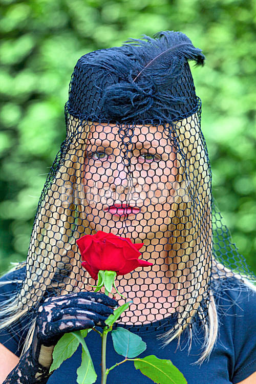 Beschreibung Eine junge, trauernde Witwe mit Schleier und Rose. Todesfall und Erbschaft.