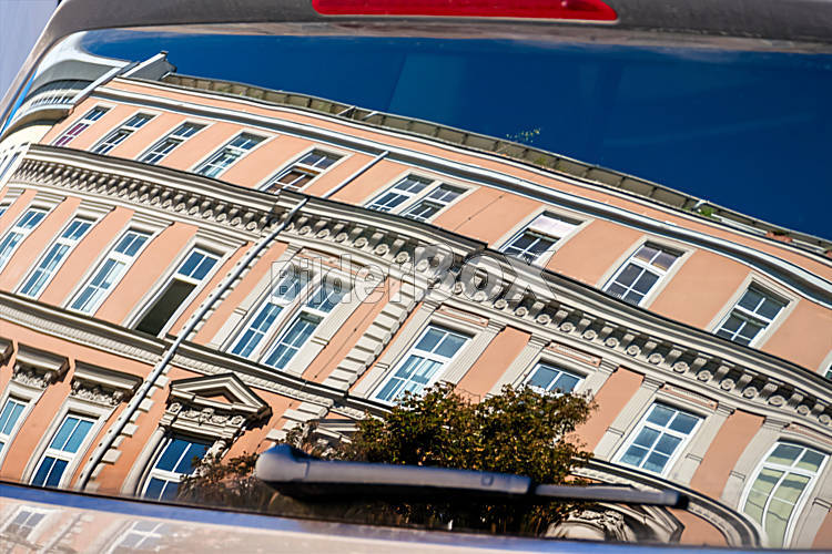 Beschreibung Schöne, alte Wohnhäuser spiegeln sich in den Fenstern eines Autos