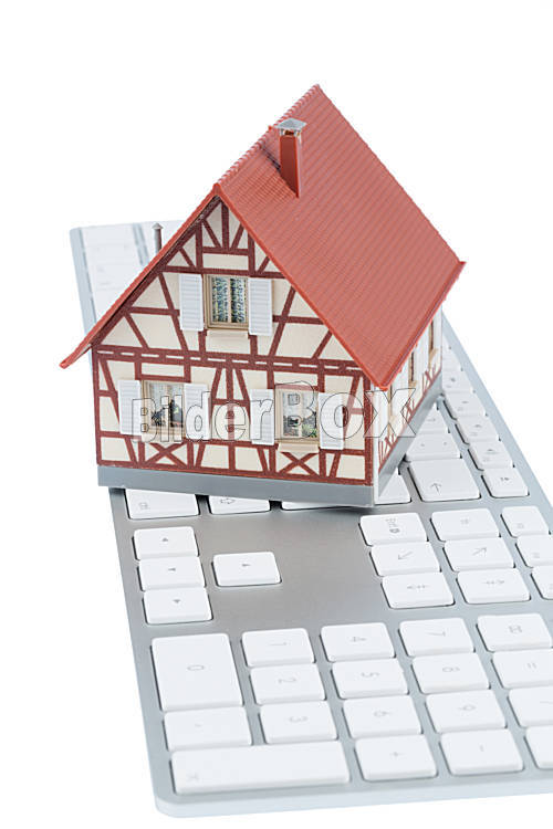 Beschreibung Wohnhaus auf Tastatur, Symbolfoto für Hauskauf und Vermietung über das Internet